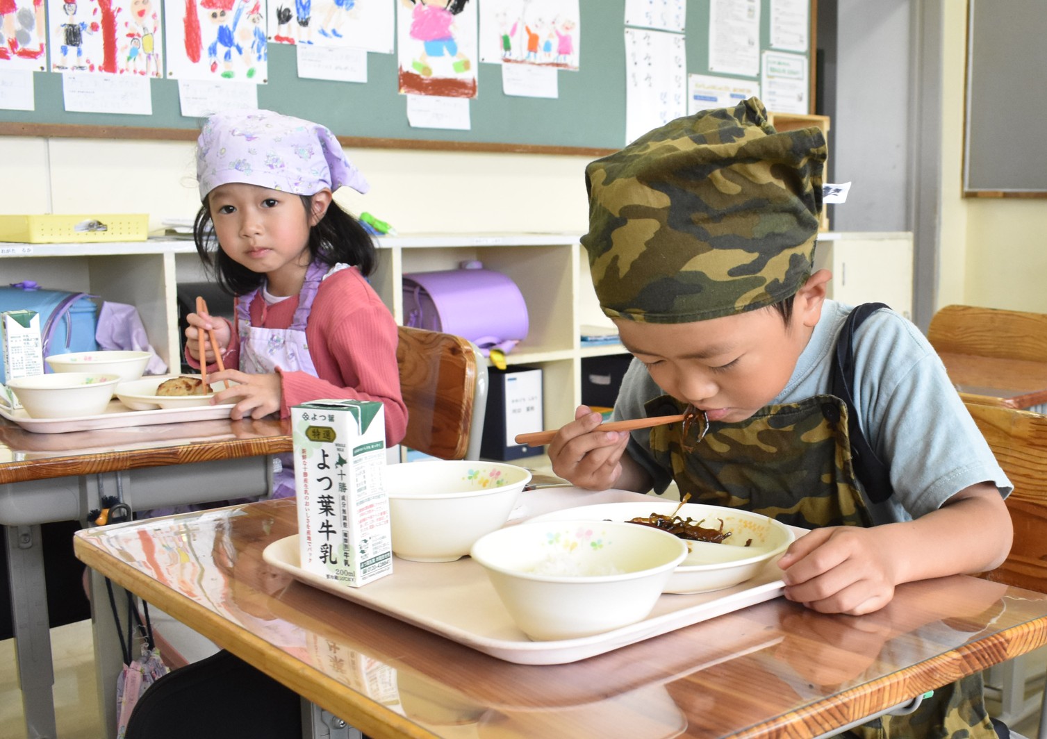 [写真/ふるさと給食「フキとコンブの佃煮」を味わう1年生]