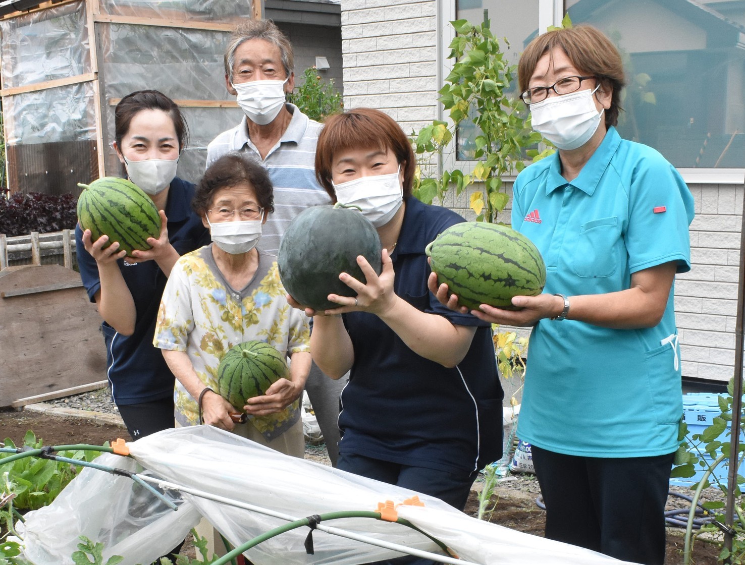 [写真/大きく実ったスイカを手に利用者とスタッフ]