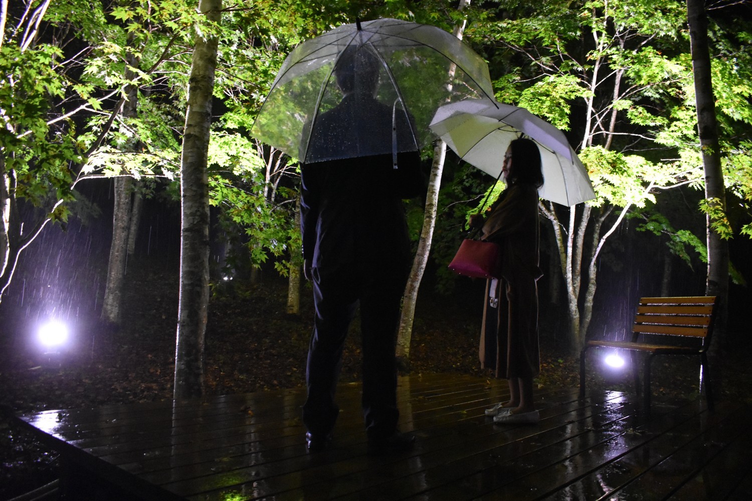 [写真/ライトアップされた「ロータリーの杜」を観賞する中標津ロータリークラブの会員]