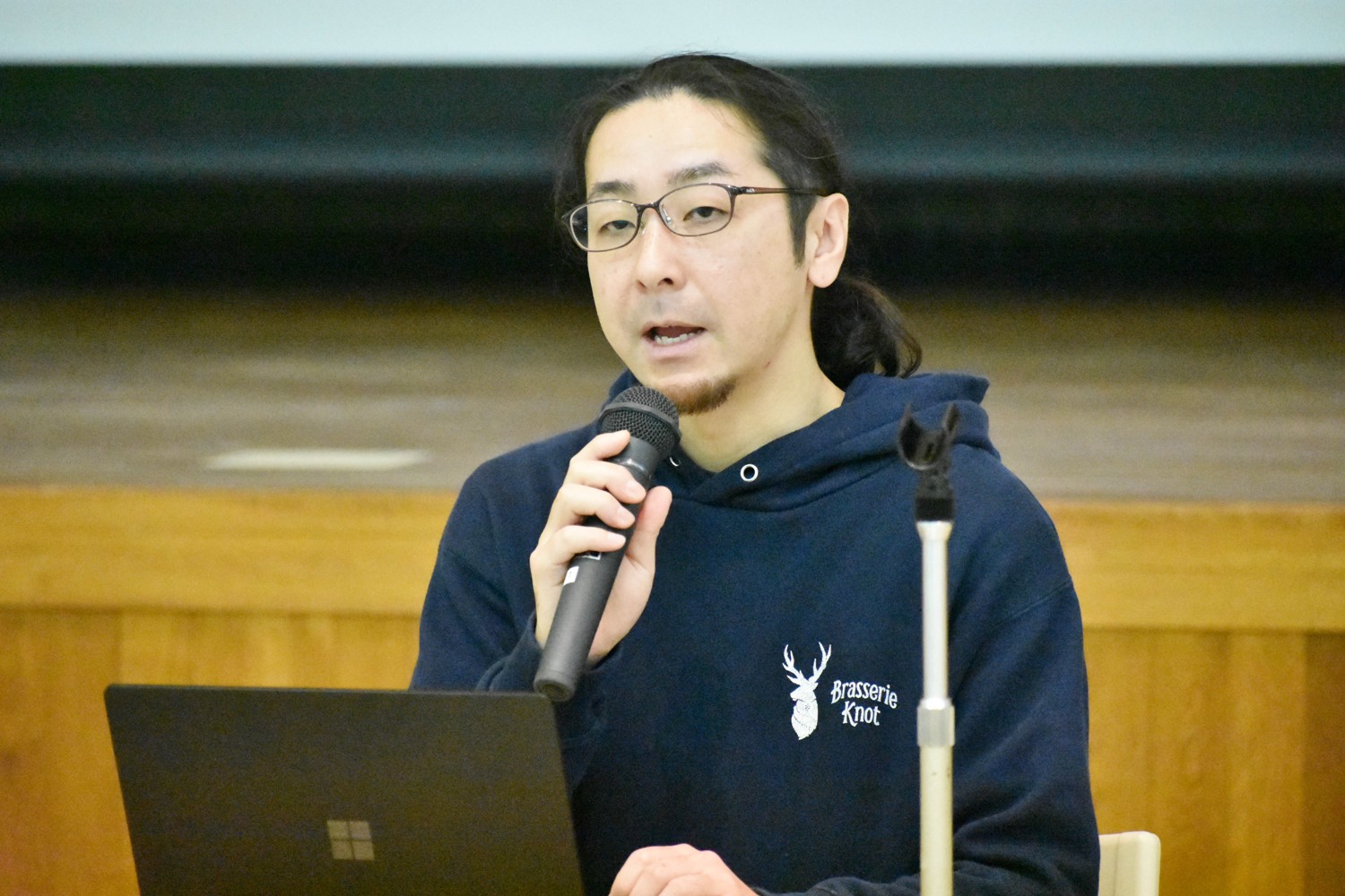 [写真/ビール醸造を通した「つながり」について語る植竹さん]