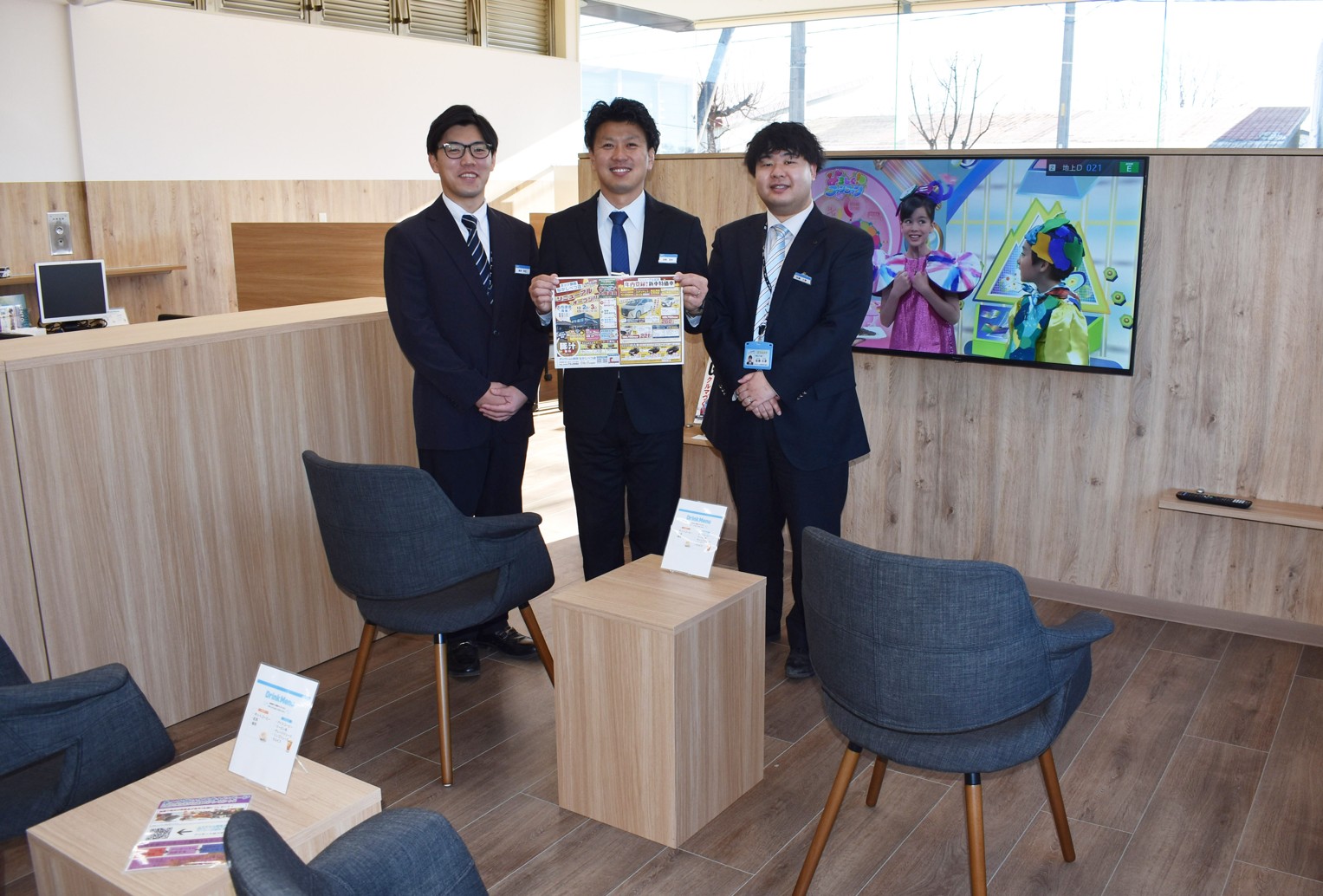 [写真/従来の1.5倍広くなった店内待ち合いスペース。2、3の両日に開くリニューアルイベントをPRする岩崎店長(中央)らスタッフ]