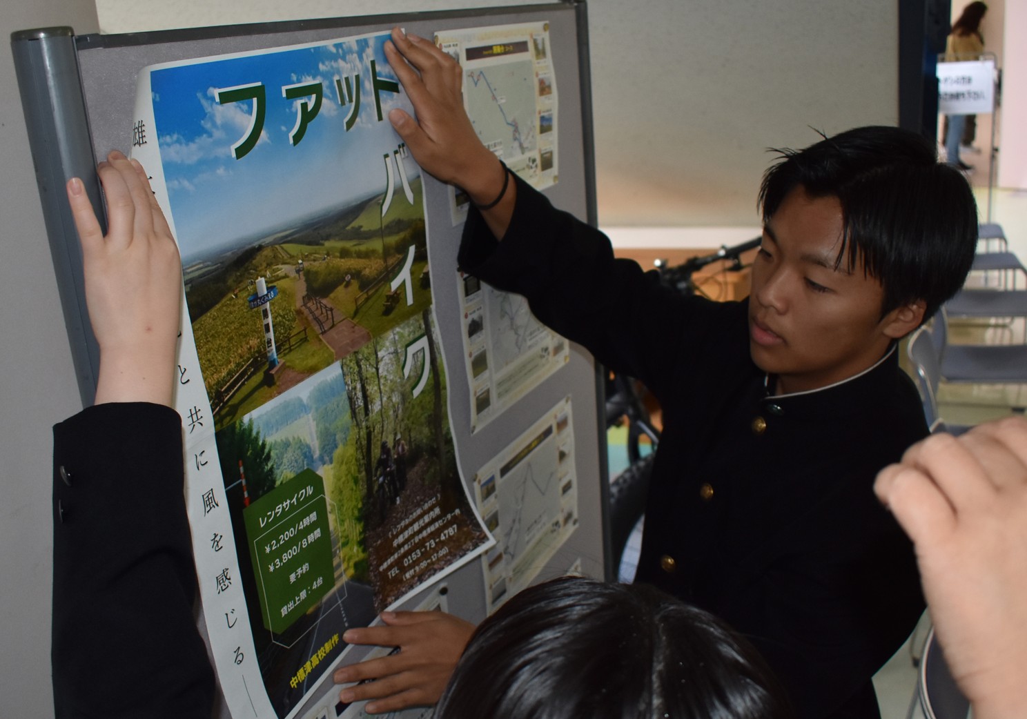 [写真/作製したポスターを経済センター(なかまっぷ)に掲示しファットバイクをPRする生徒たち]