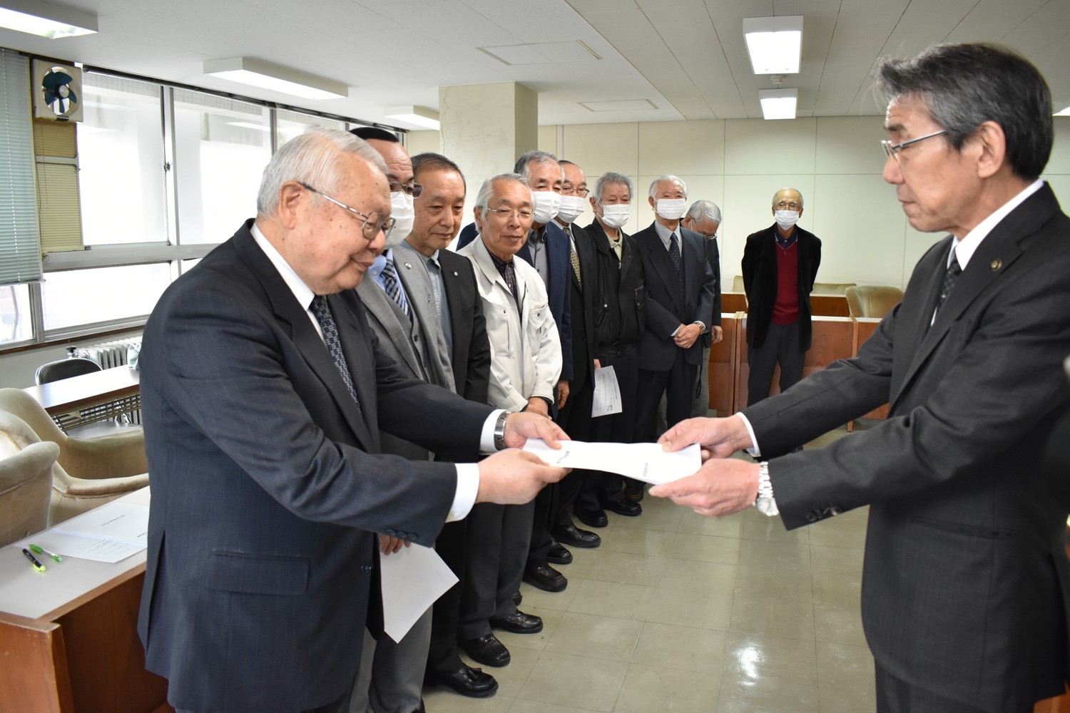 [写真/蝦名市長(右)に要望書を手渡す牧野会長]