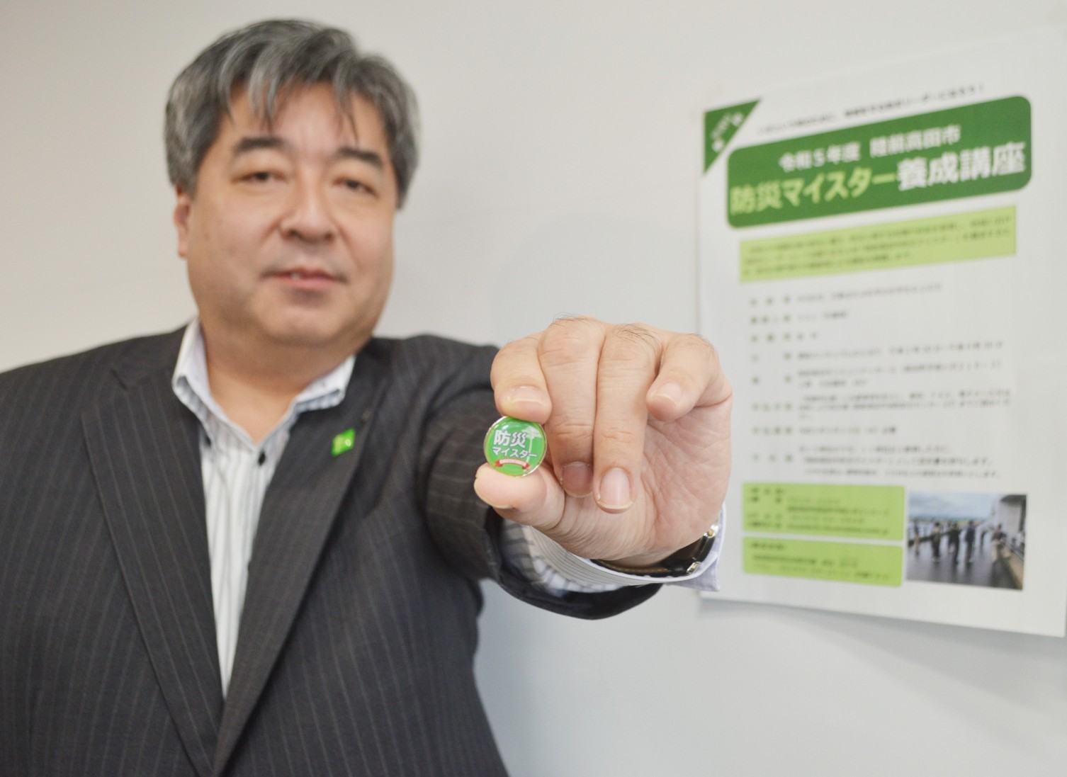 [写真/陸前高田市防災マイスターーの認定バッジを手に「市民の防災意識向上に尽力していきたい」と中村課長]