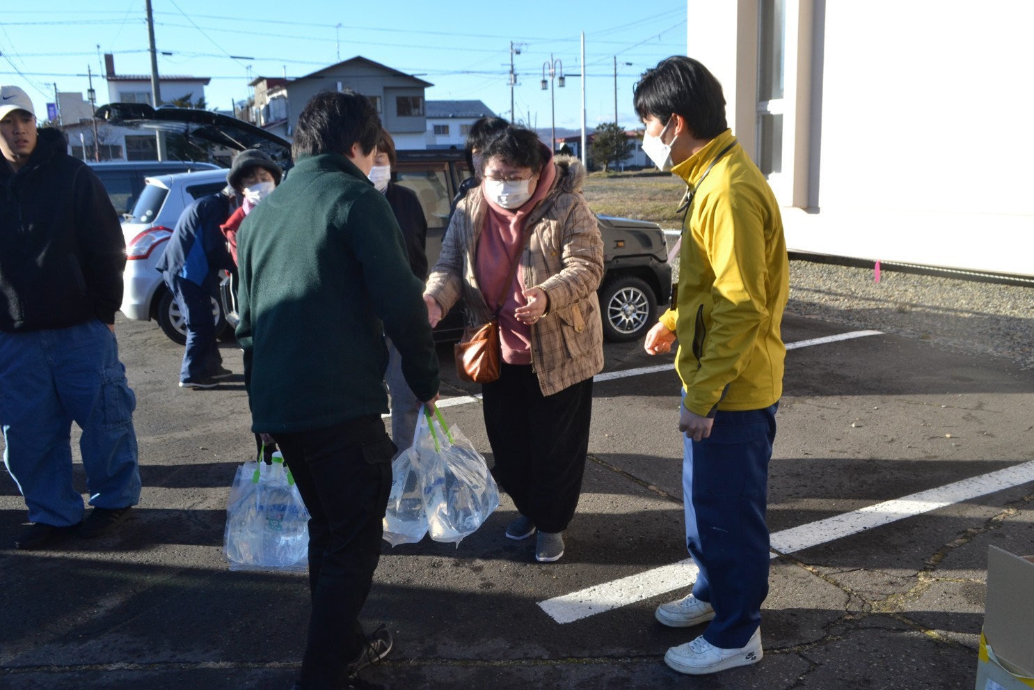 [写真/給水地点で職員から水を受け取る町民ら(4日午後0時50分ごろ、町社会福祉センター前)]