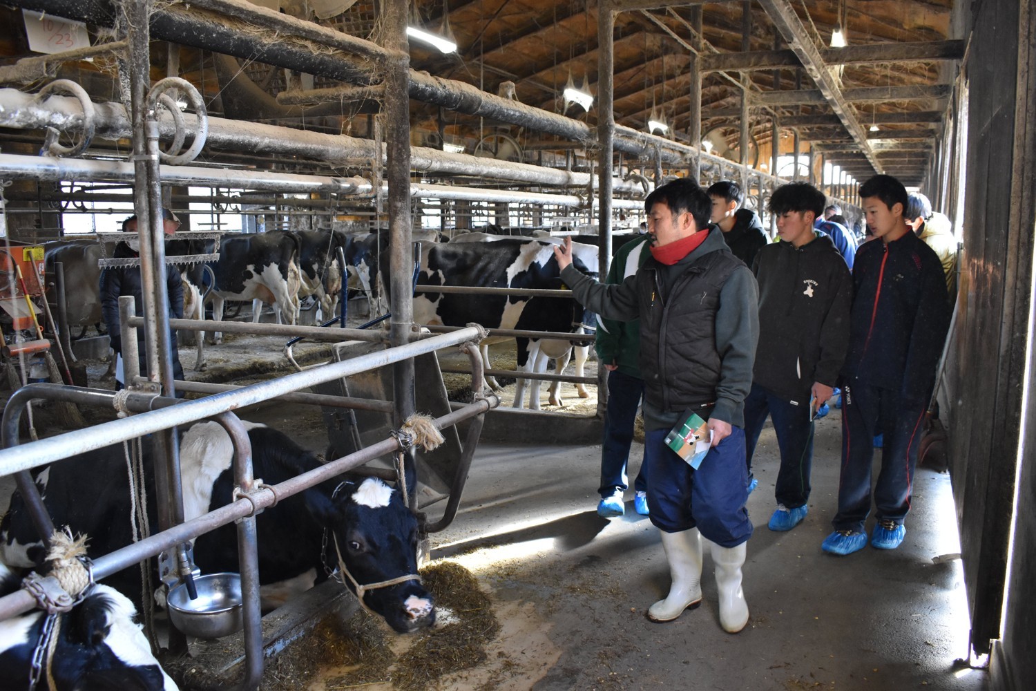 [写真/標茶町の高橋牧場を見学する高校生]