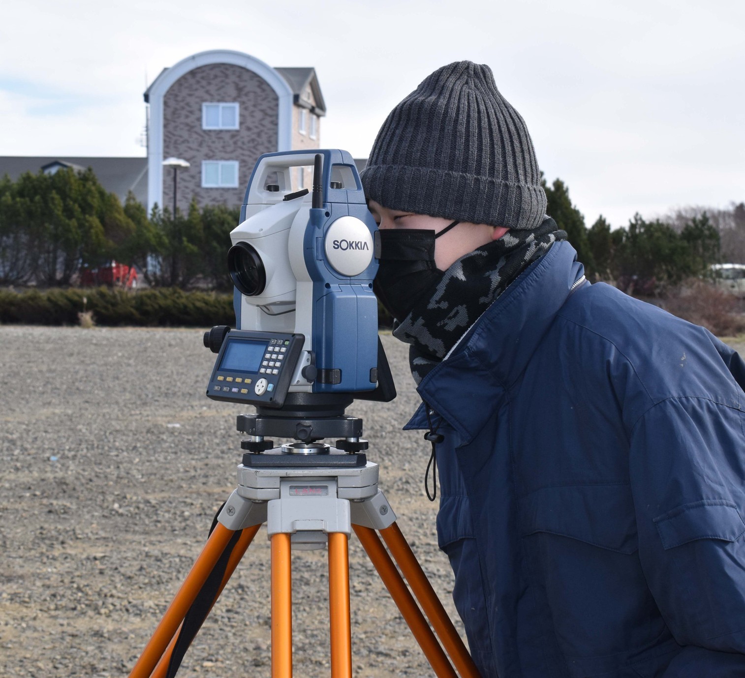 [写真/測量を体験する川上さん]