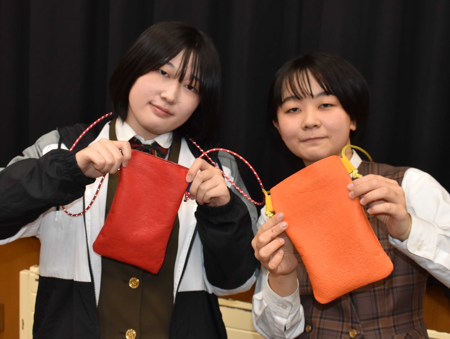 [写真/完成したサコッシュを手にする別海高校の生徒]