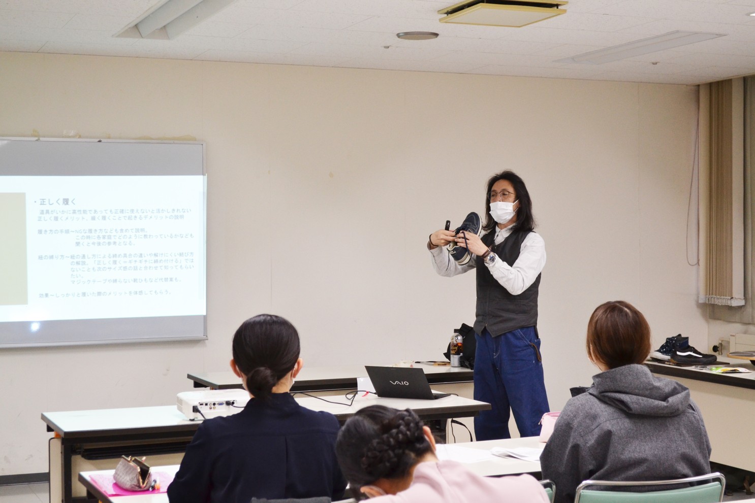 [写真/正しく靴を履くことを説明する加藤氏]