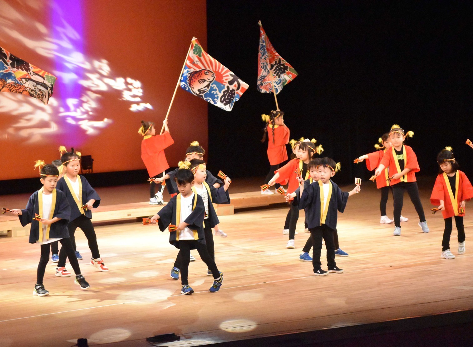 [写真/ヨサコイを披露する園児ら]
