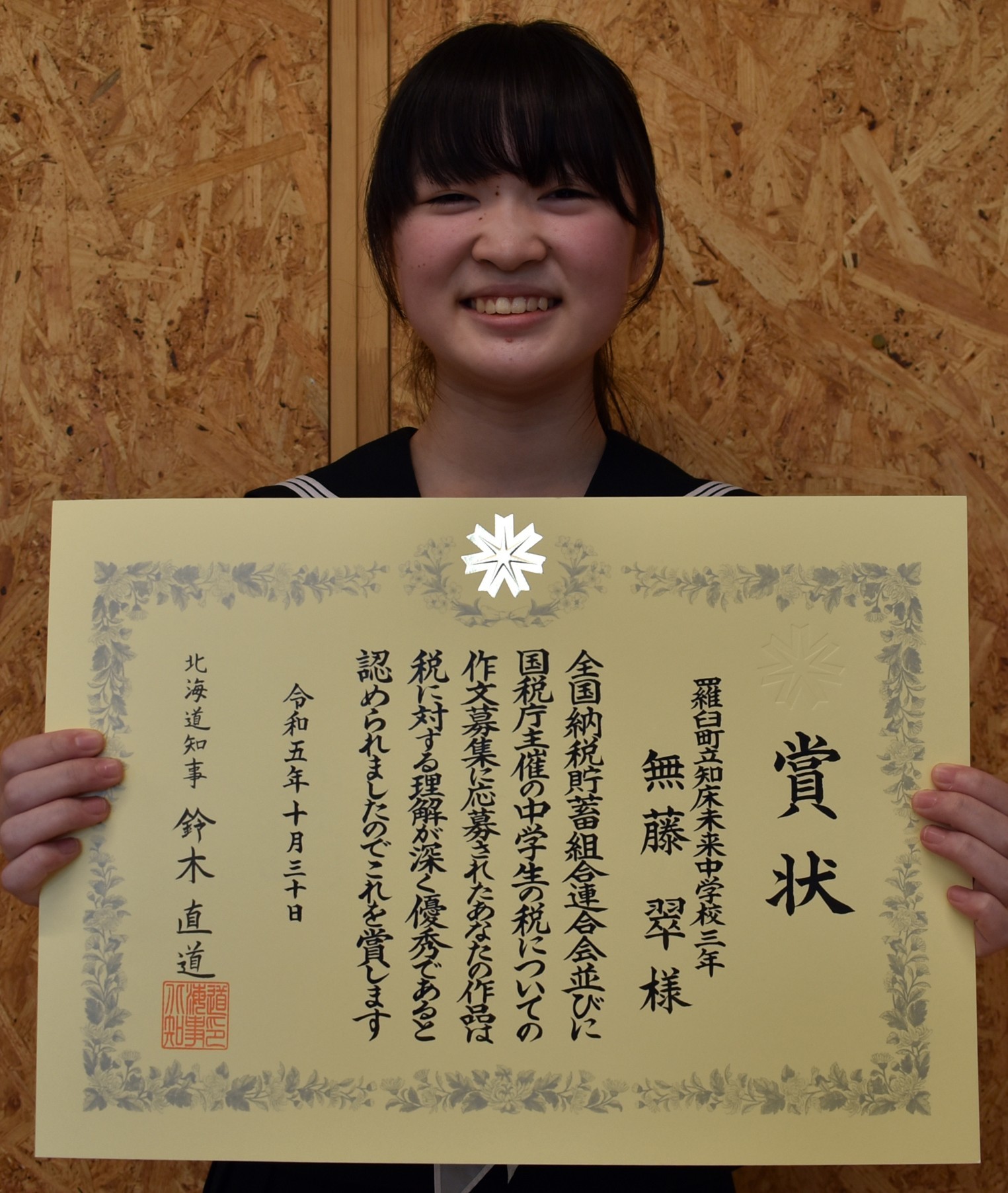 「税の作文」知床未来中・無藤さん道知事賞【羅臼】(2023-12-10)