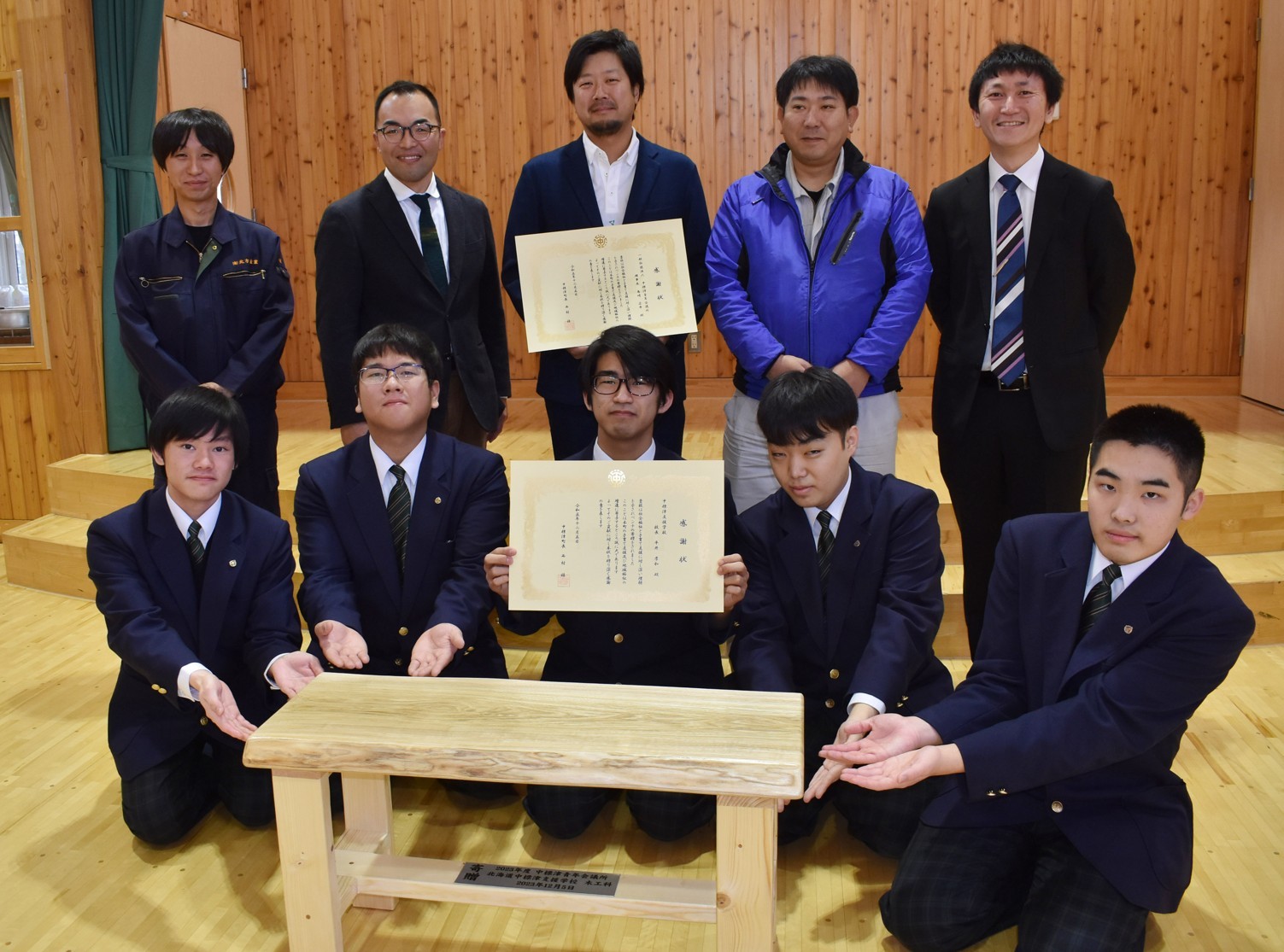 [写真/ベンチを寄贈した中標津JCメンバーら(後列)と製作した木工科の生徒たち(前列)]