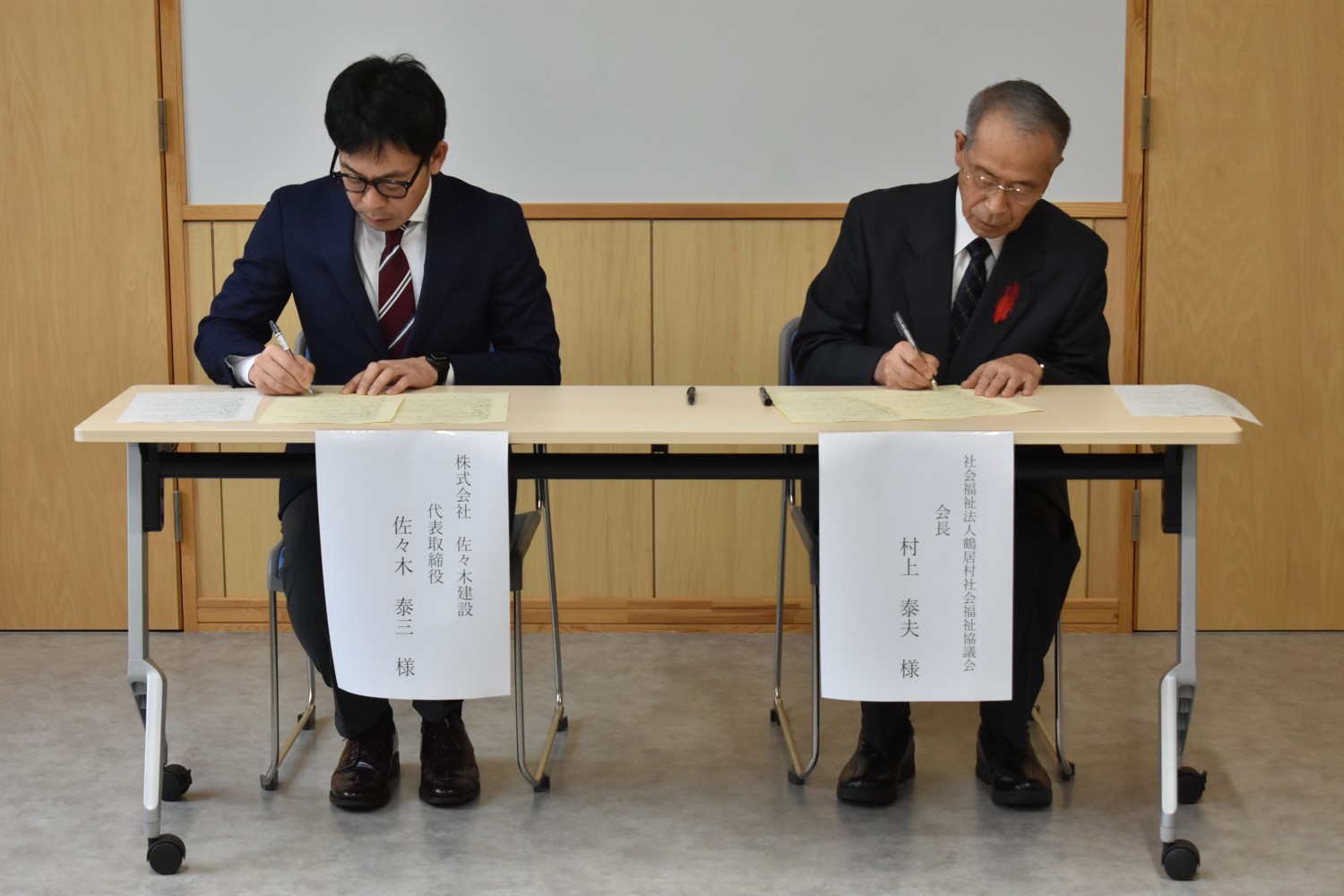 [写真/協定書に記入する佐々木代表取締役と村上会長(左から)]
