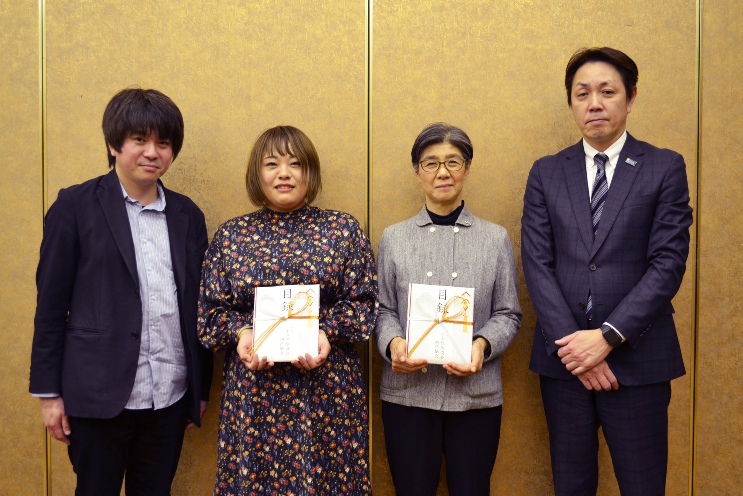 [写真/谷口会長(右)と目録を受け取った2団体の代表者]
