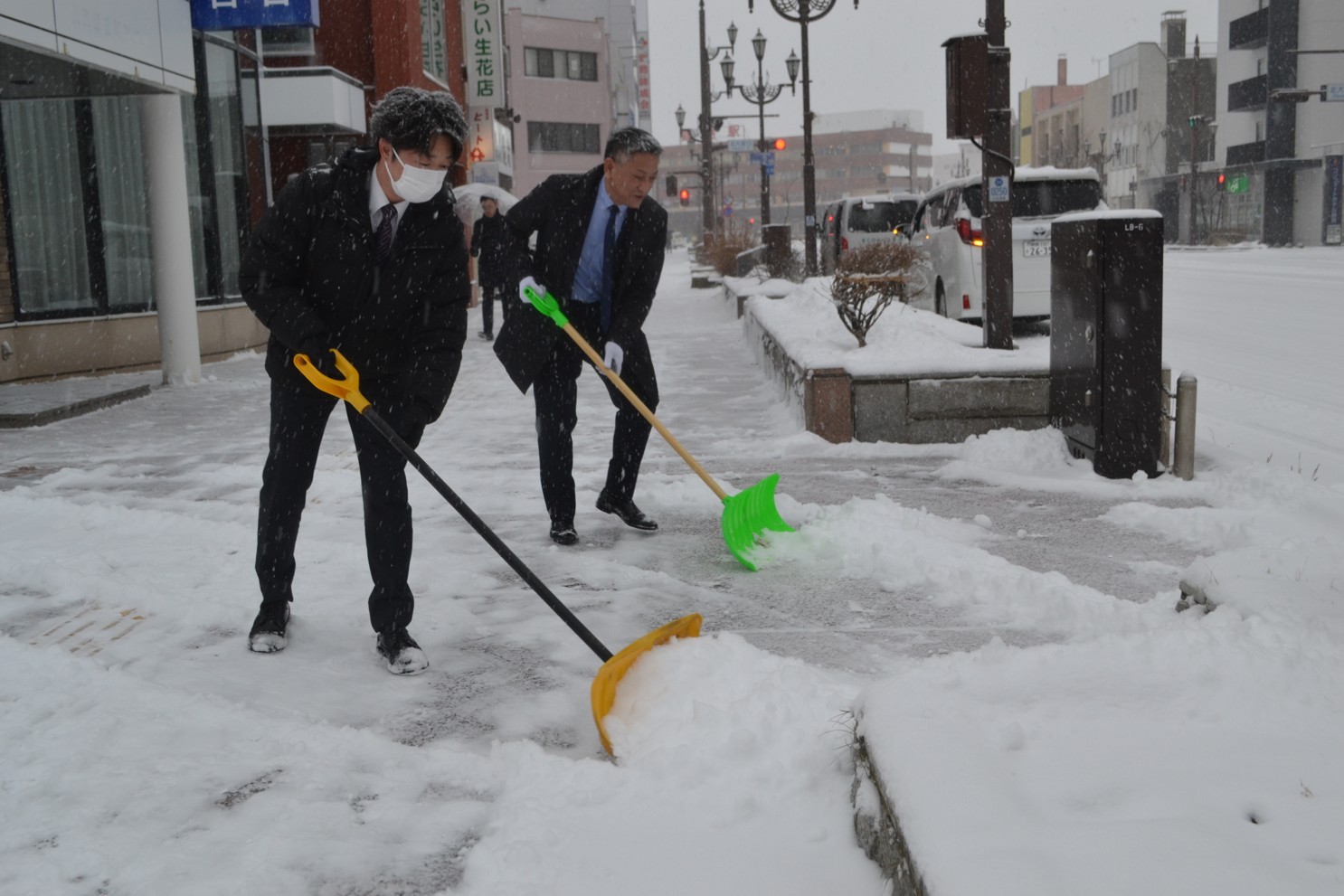 [写真/今季初の雪かきに追われる市民ら(12日午前8時ごろ、釧路市北大通)]