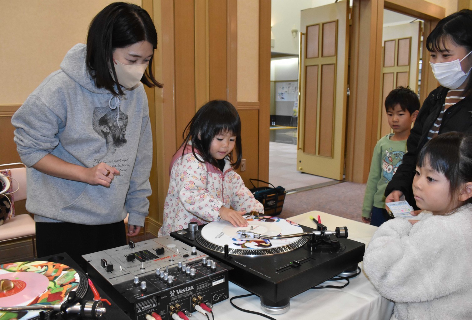 [写真/DJ体験ブースでスタッフ(左端)に教えてもらい機器操作をする参加者]