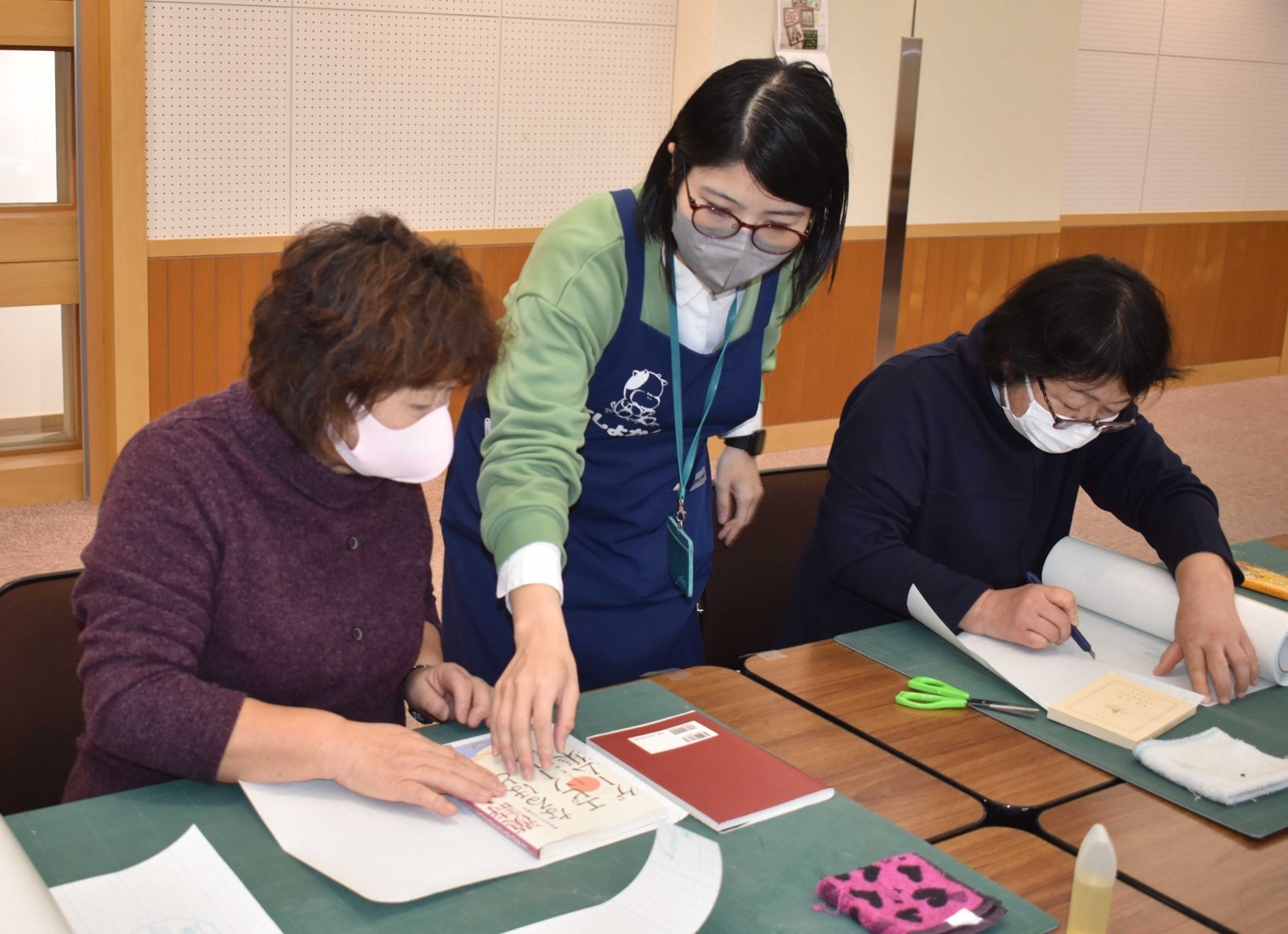 [写真/図書館の職員(中央)に指導を受ける参加者]