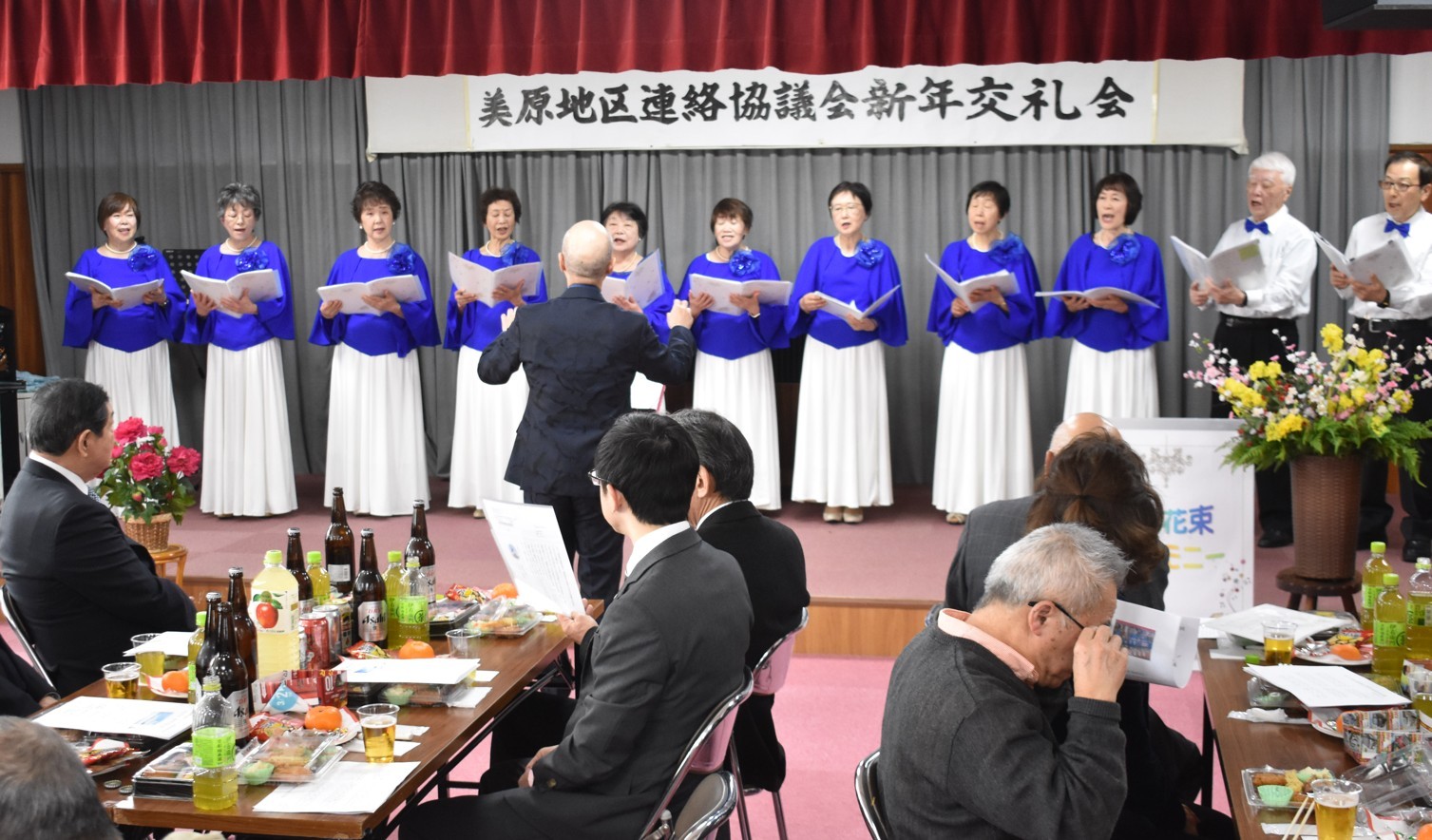 [写真/祝宴で歌声を披露した合唱団「こころの花束ハーモニー」]