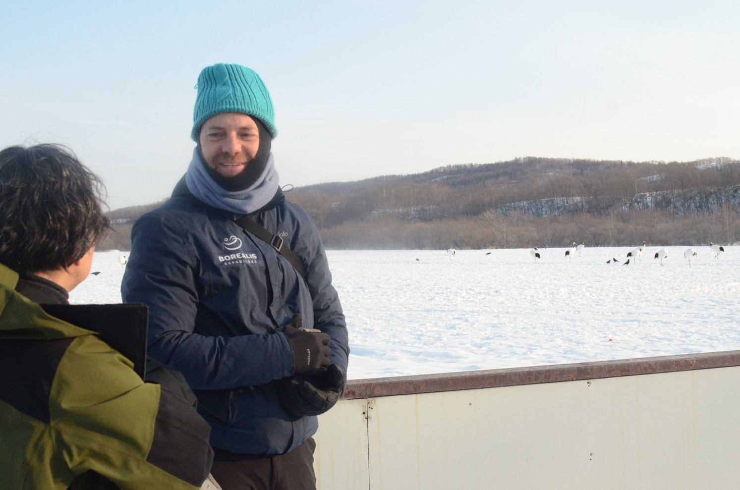 [写真/早朝のタンチョウへの給餌を観察するツアー一行]