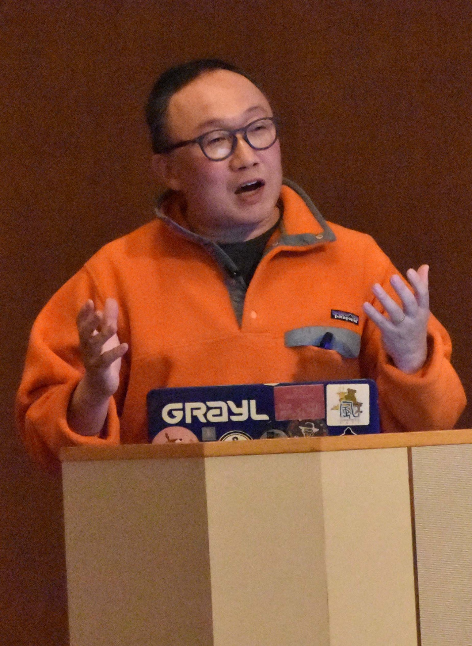 [写真/「水のカムイ観光圏協議会」の観光地域づくりセミナーで講演する北海道宝島旅行社の菊地さん]