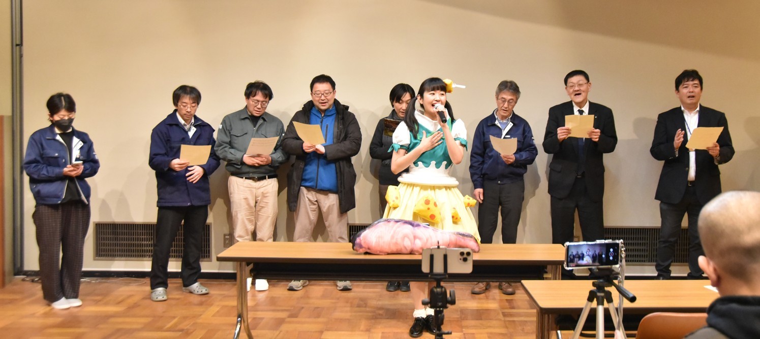 [写真/博物館職員と共に、テーマソングを熱唱する秋葉さん(中央)]