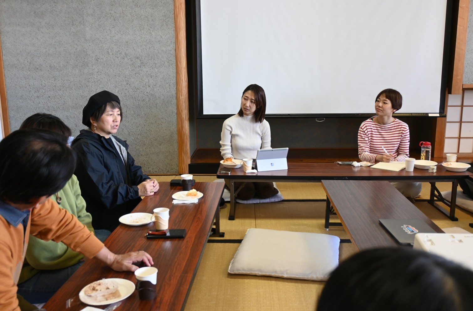 [写真/座談会で市民と意見交換をする夏堀釧路市議(右端)とくにい浜中町議(右から2人目)]