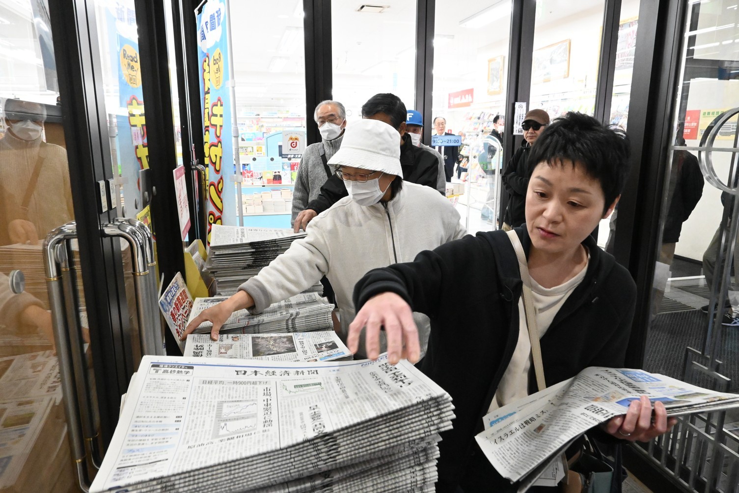 [写真/各紙を次々と手に取る市民(6日午前9時ごろ)]