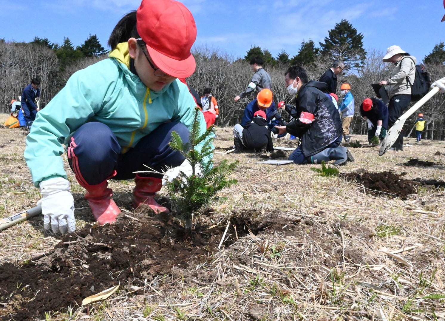 [写真/トドマツの苗木を植える児童ら]