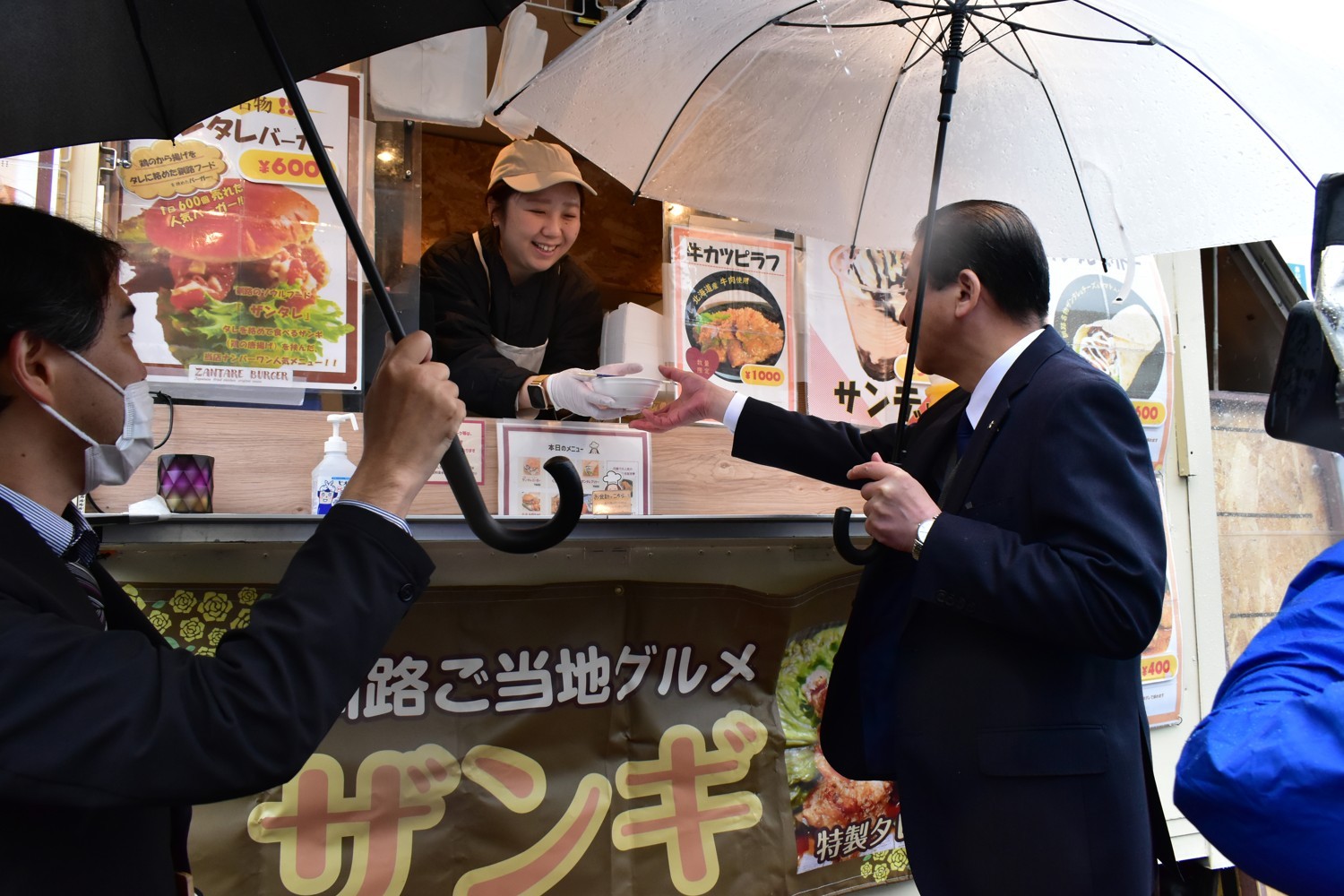[写真/雨の中、温かい食事を受け取る吉田副市長(右)]