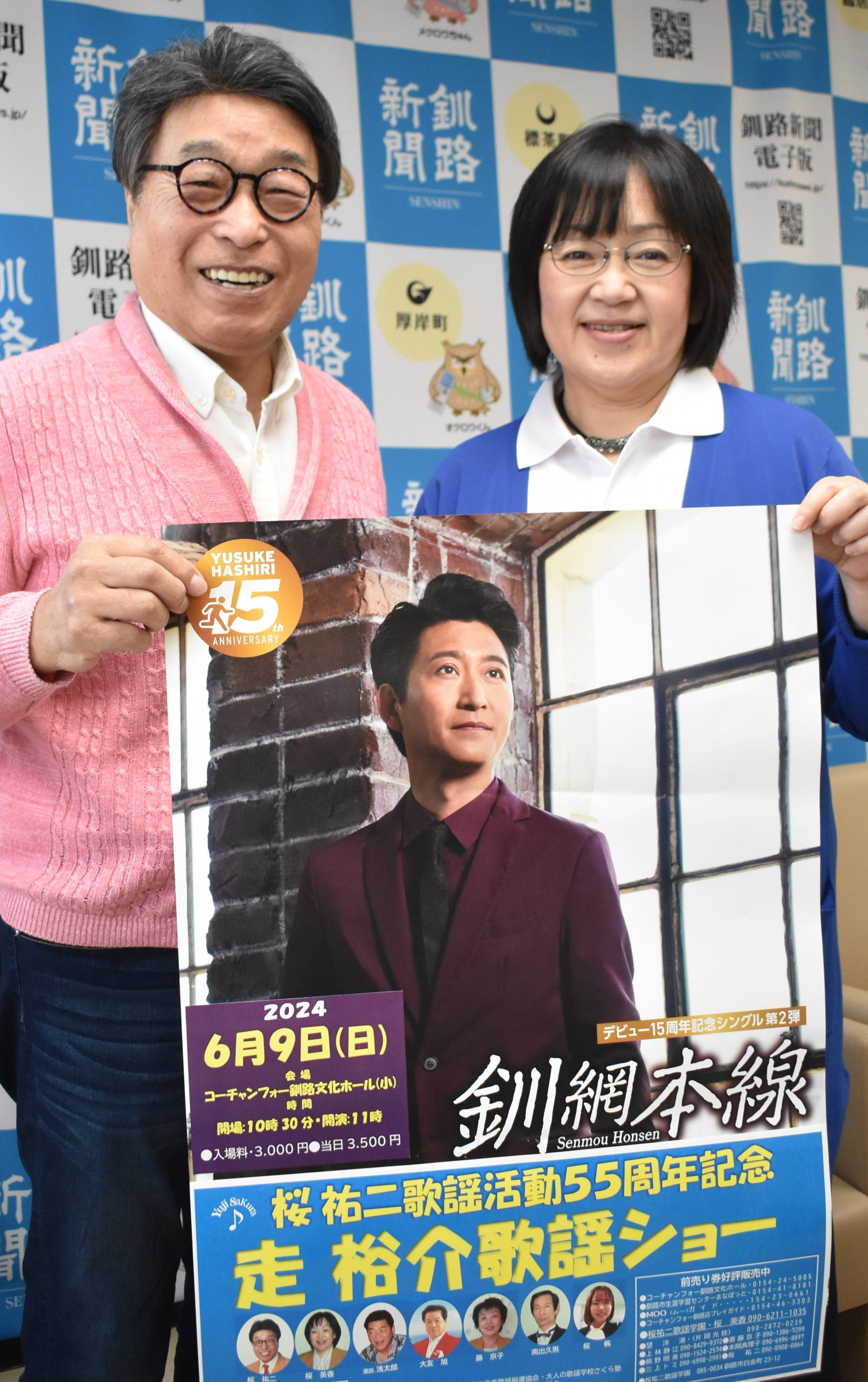 [写真/ポスターを手に節目の「歌謡ショー」をアピールする桜代表(左)と愛弟子の桜美香さん]