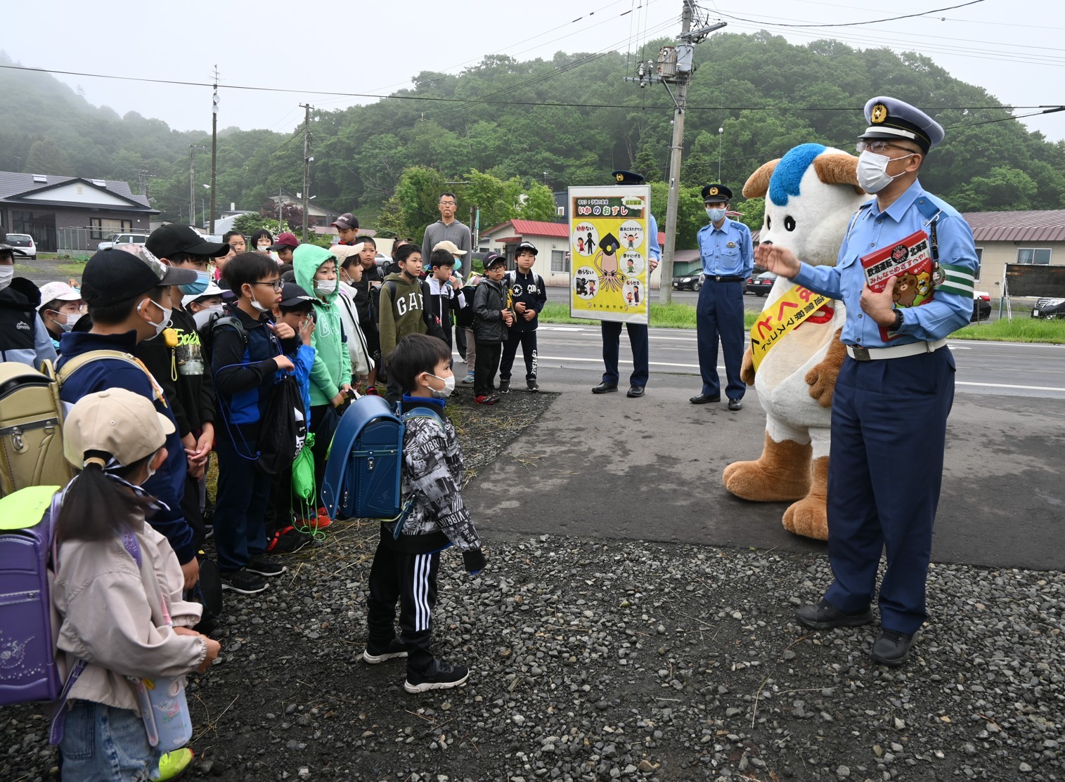 [写真/登校する児童に交通安全や防犯を呼び掛ける警察官ら(釧路町別保)]