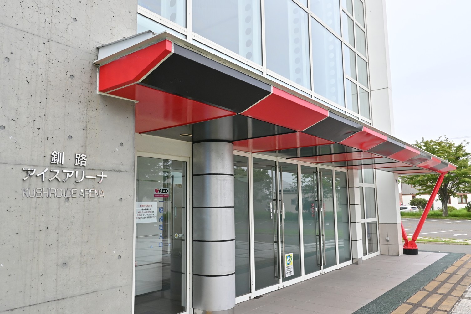[写真/クレインズのロゴマークが撤去された釧路アイスアリーナ。わずかにチームカラーの赤黒のゲートが残る]