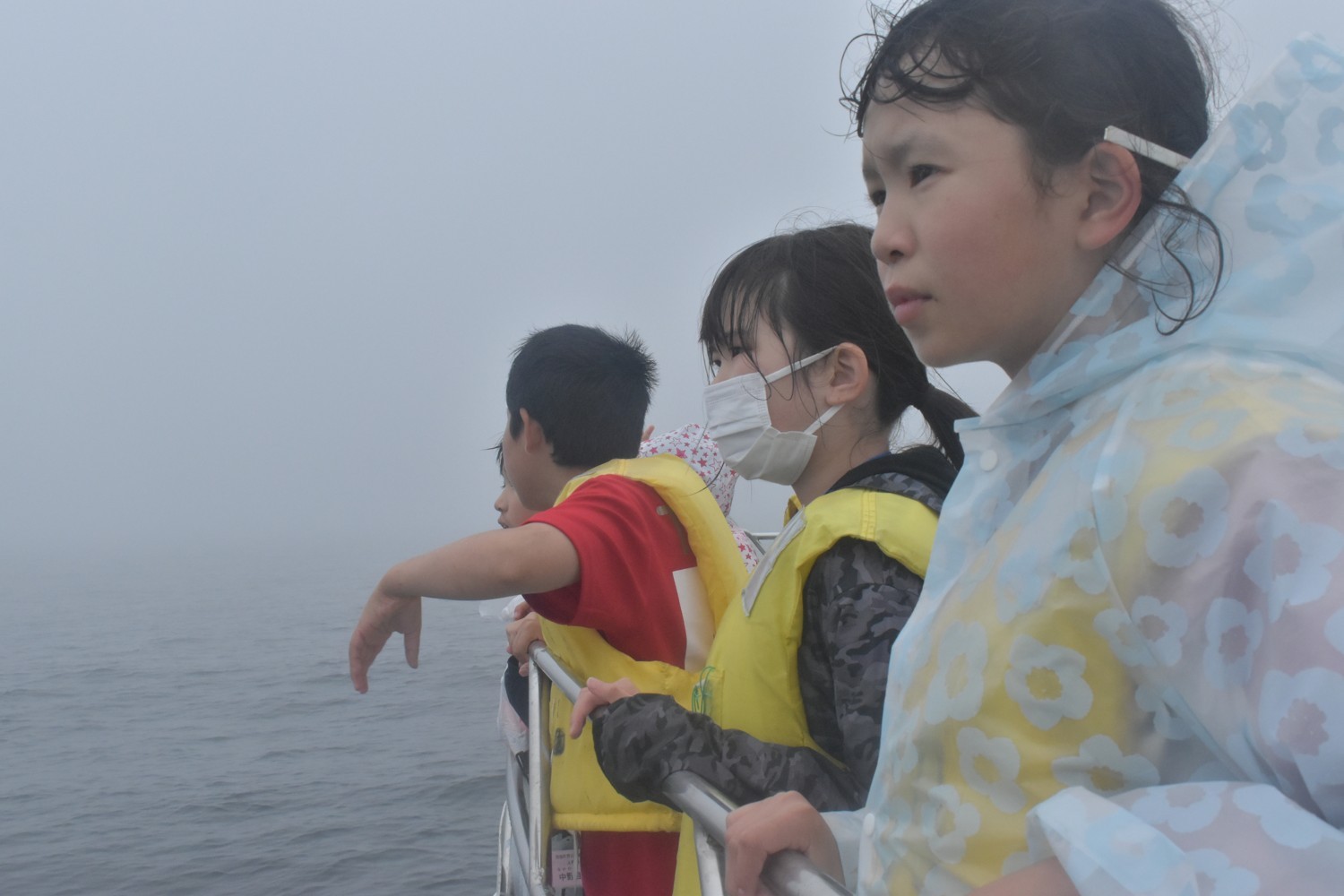 [写真/濃霧で島は見えなかったが、子供たちは洋上に出て北方領土について学んだ]