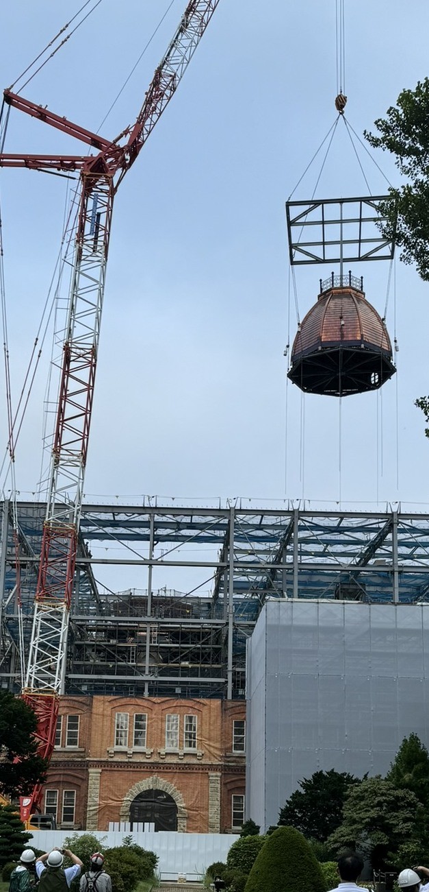 [写真/大型クレーンでつり上げられた赤褐色の八角塔の屋根]