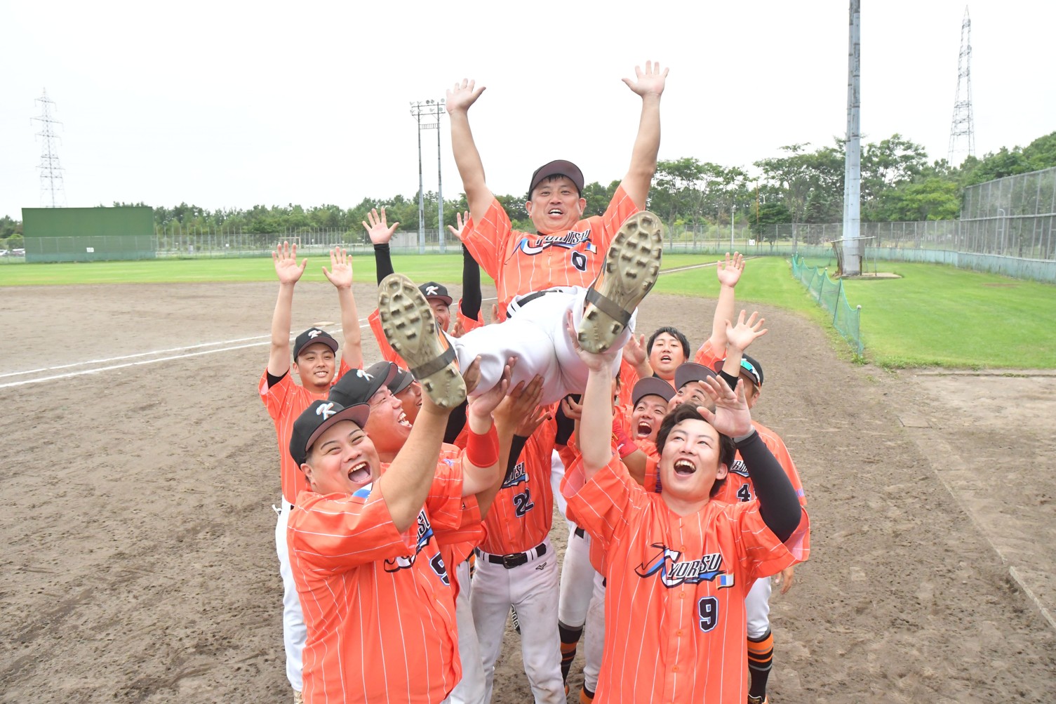 [写真/4年ぶりに釧新あさ野球を制した共立。胴上げされる石原監督代行]