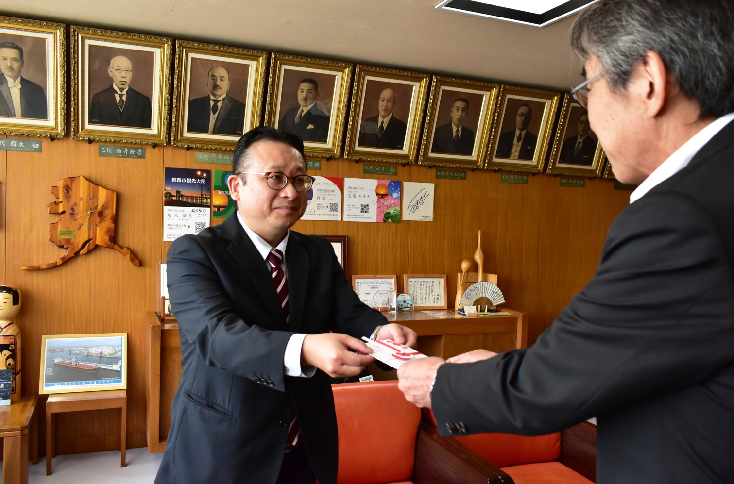 [写真/寄付金を手渡す清水代表取締役(左)]