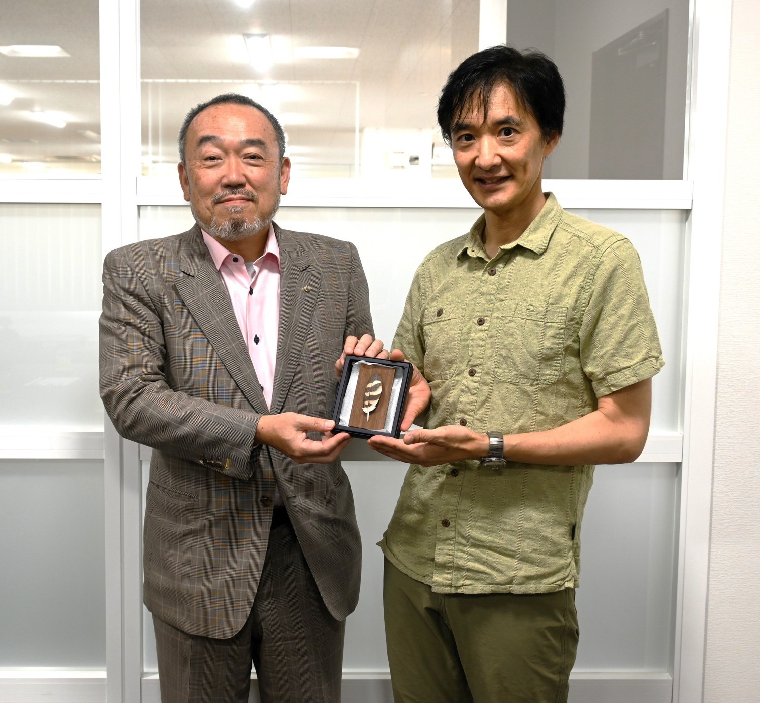 [写真/返礼品を手にする坂根社長と齊藤代表(左から)]
