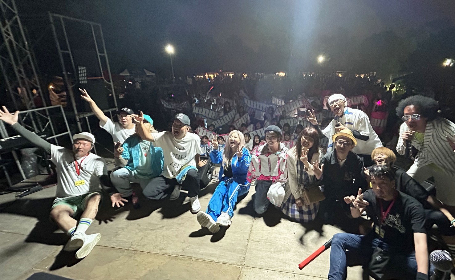 [写真/㊤明代表(左端)やMINMI(左から5人目)らスタッフで記念写真㊦タオルを回して盛り上がる来場者]