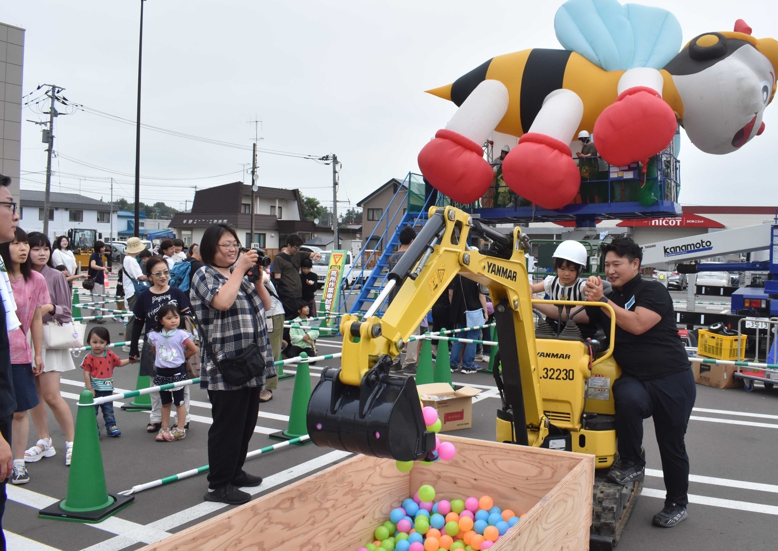 [写真/スタッフの支援を受けてミニバックフォーの操作をする参加者(右から2人目)]