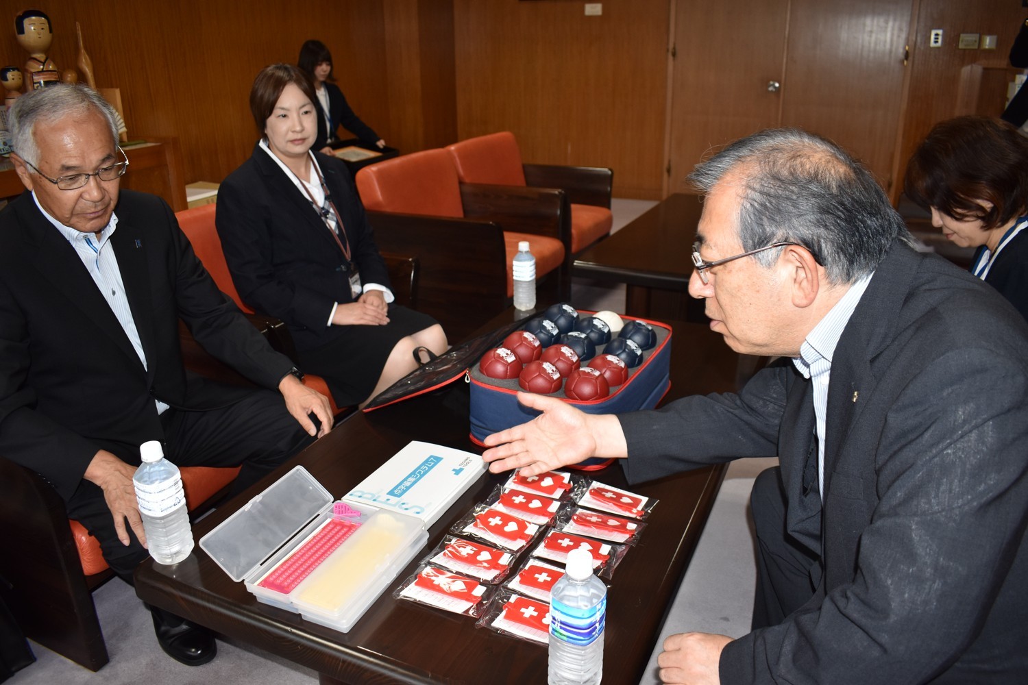 [写真/寄付した品目を説明する亀岡社長(左)]