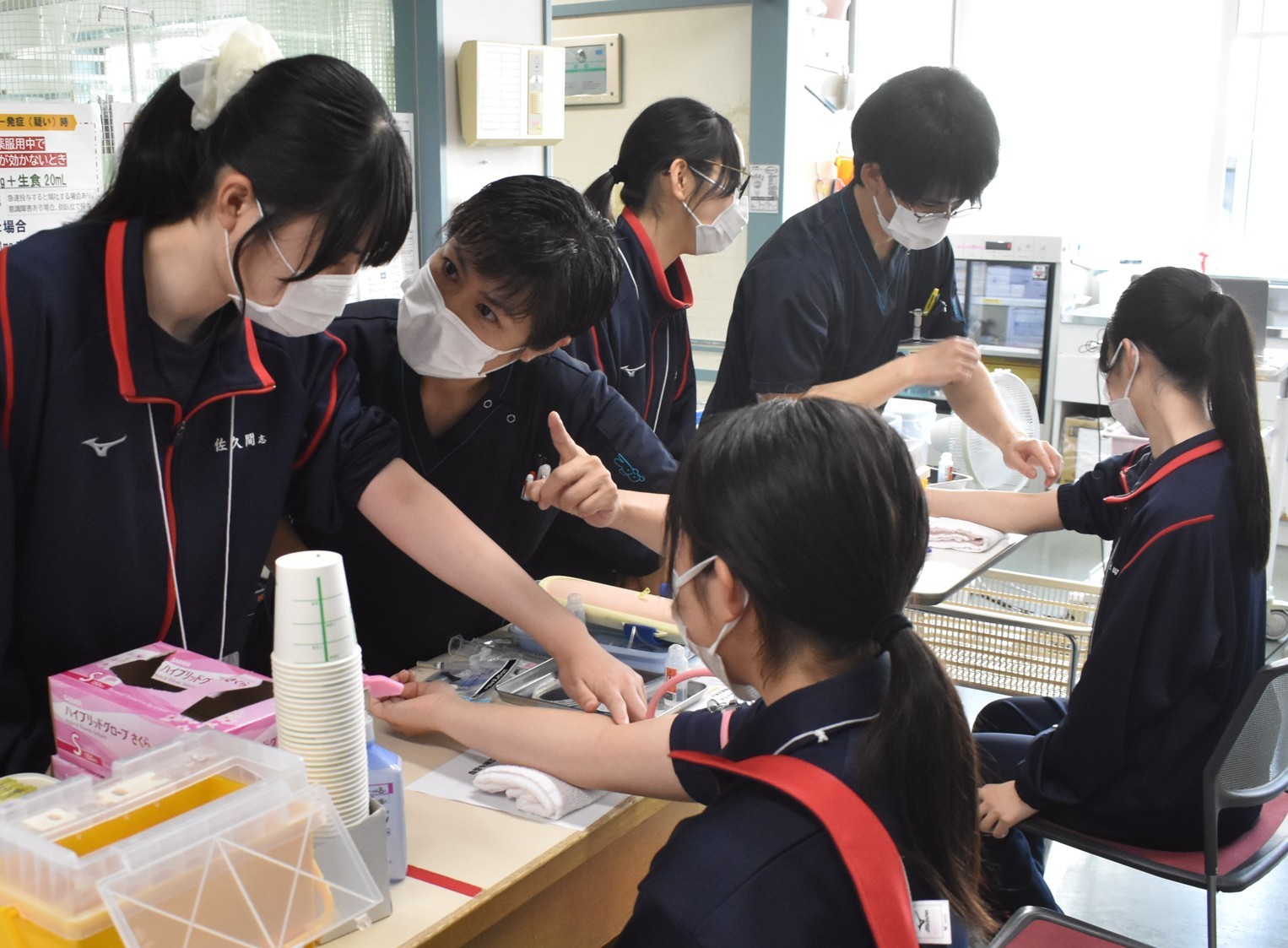 [写真/看護師の指導で採血を体験する参加生徒]