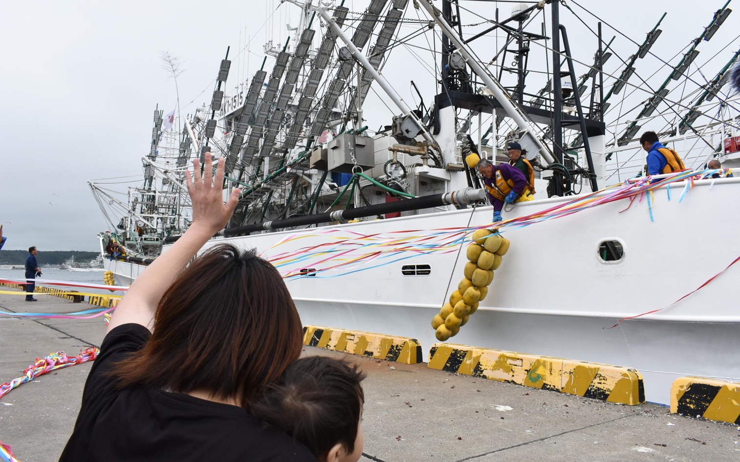 [写真/北太平洋の公海を目指して出漁する大型サンマ棒受け網漁船(10日午前8時すぎ、根室・花咲港)]