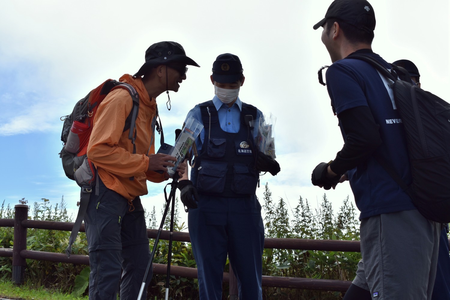 [写真/外国人登山客(左)に遭難などへの注意を呼び掛ける署員(摩周湖第1展望台)]