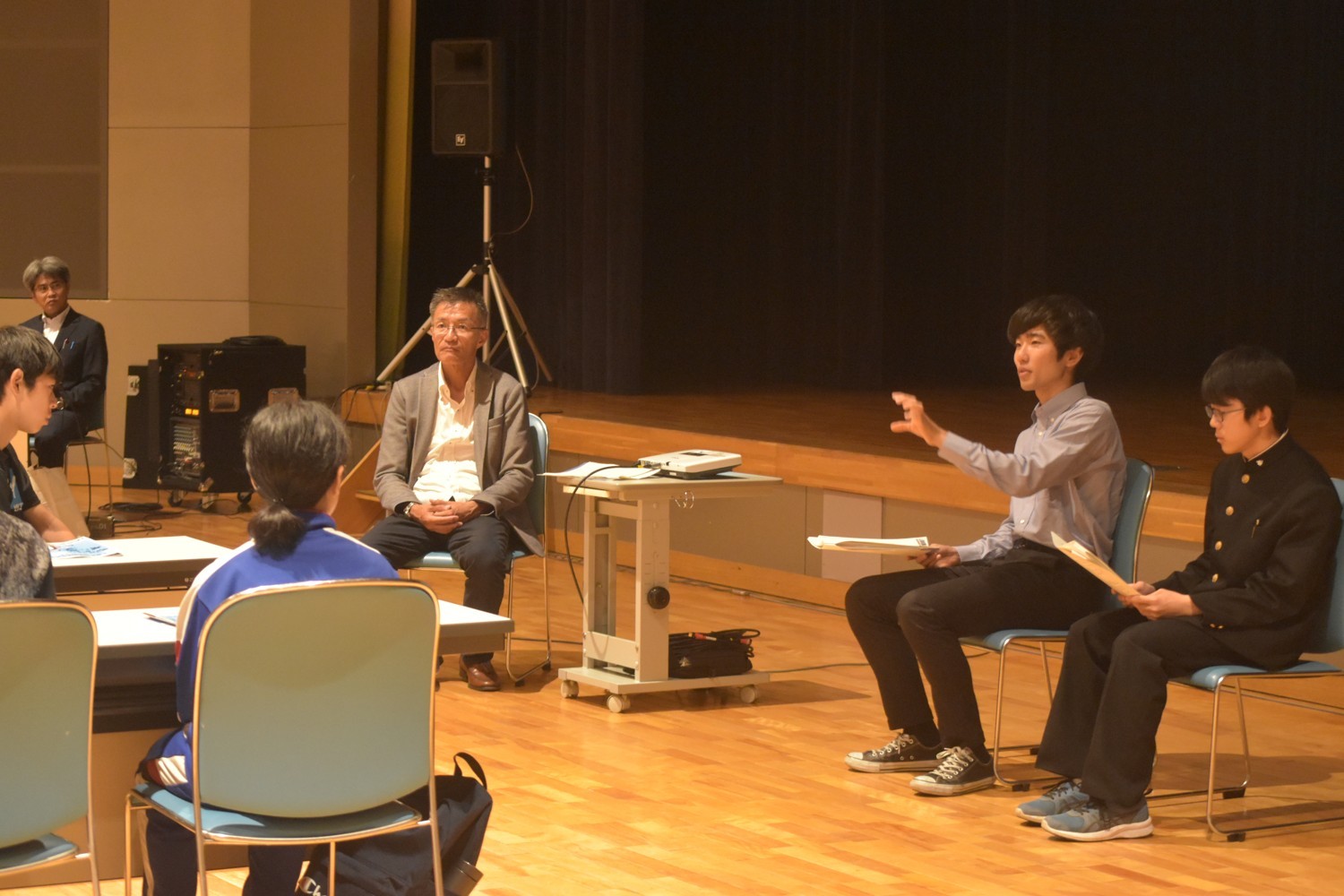 [写真/中標津出身の湖陵生らから学生生活を聞く中学生]