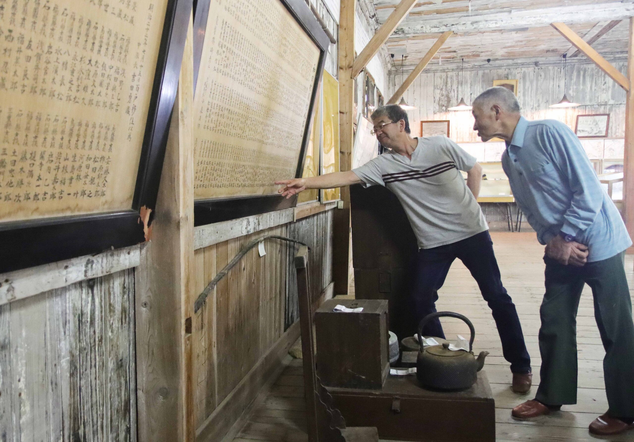 [写真/和田村開村人命記に先祖の名を見る保存会の中村会長(右)ら]