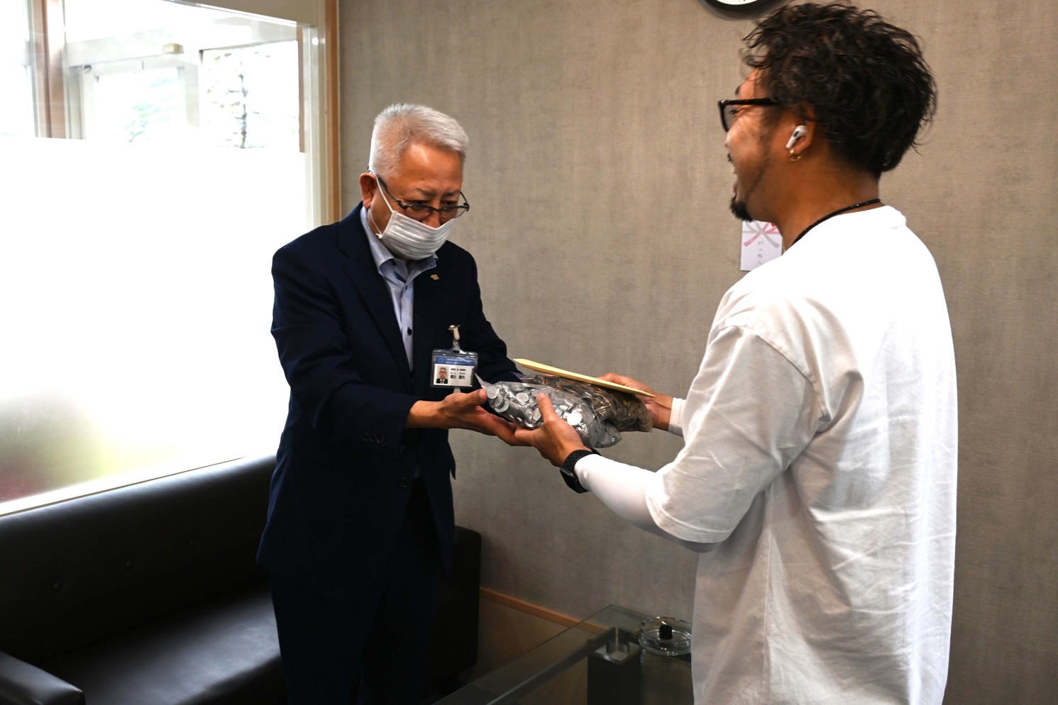[写真/楠美社長から福士事務長(左)に寄付金が手渡された]