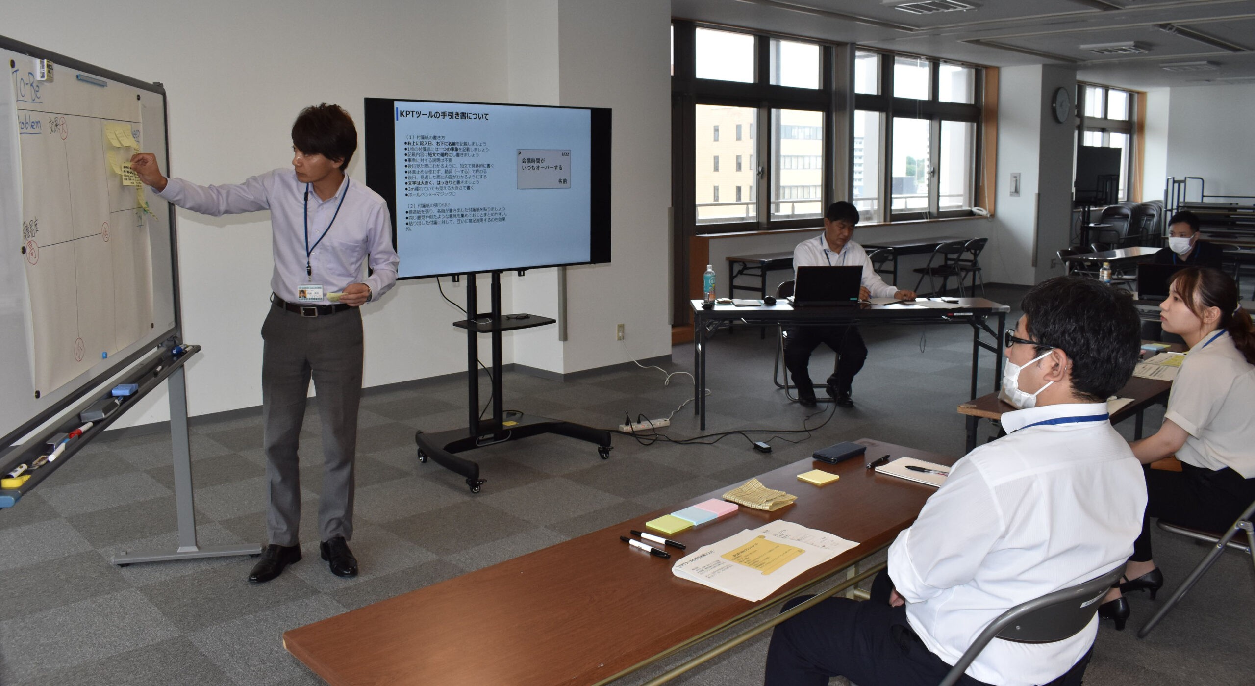 [写真/研修で業務の振り返り手法を実演する生涯学習課の職員]