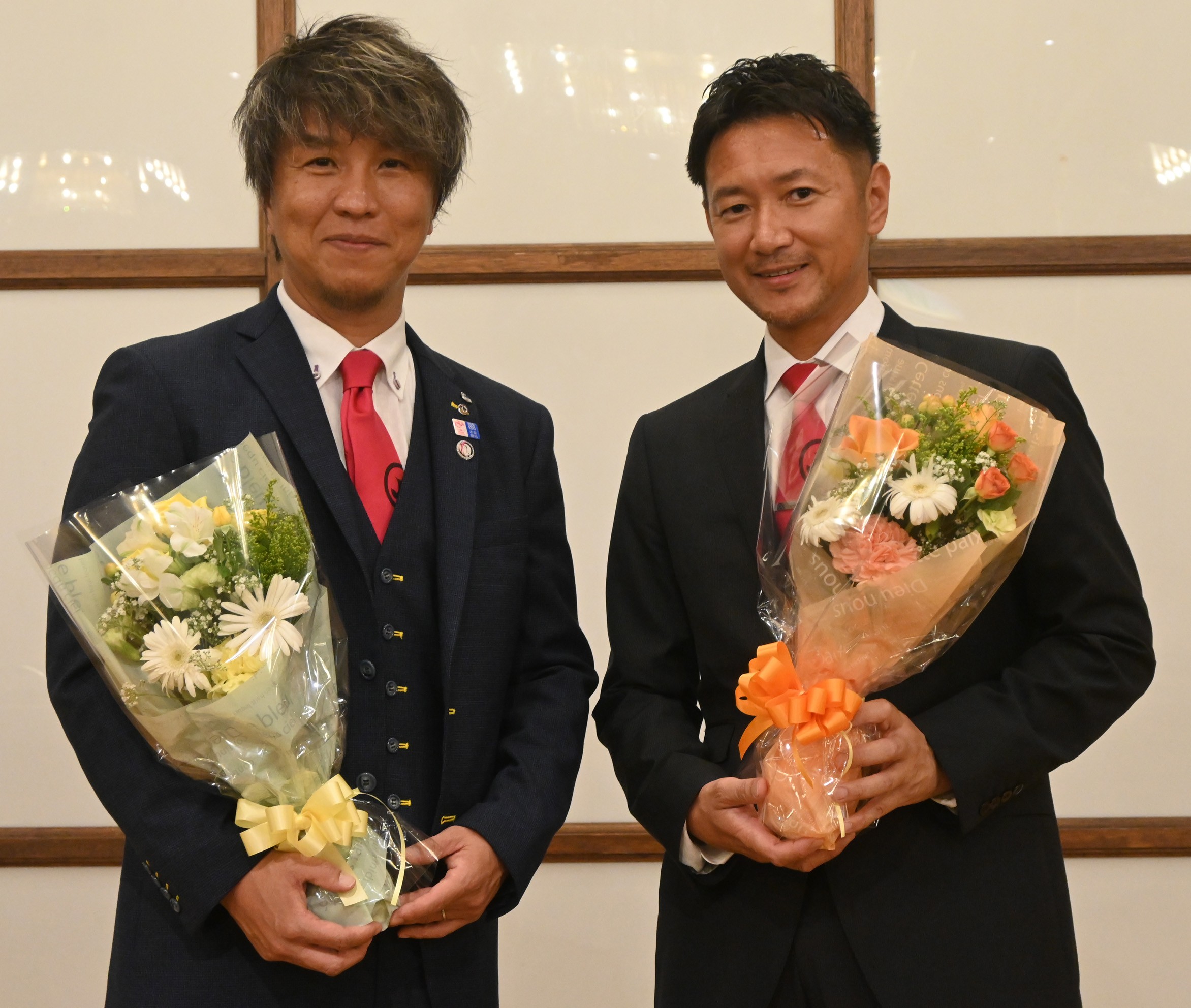 [写真/釧路YEG次年度会長予定者の尾越さん(右)と、北海道YEG次年度会長への推薦承認を受けた田野さん]