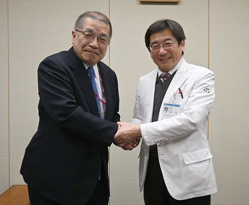 [写真/握手を交わす篠原院長(左)と近江院長]