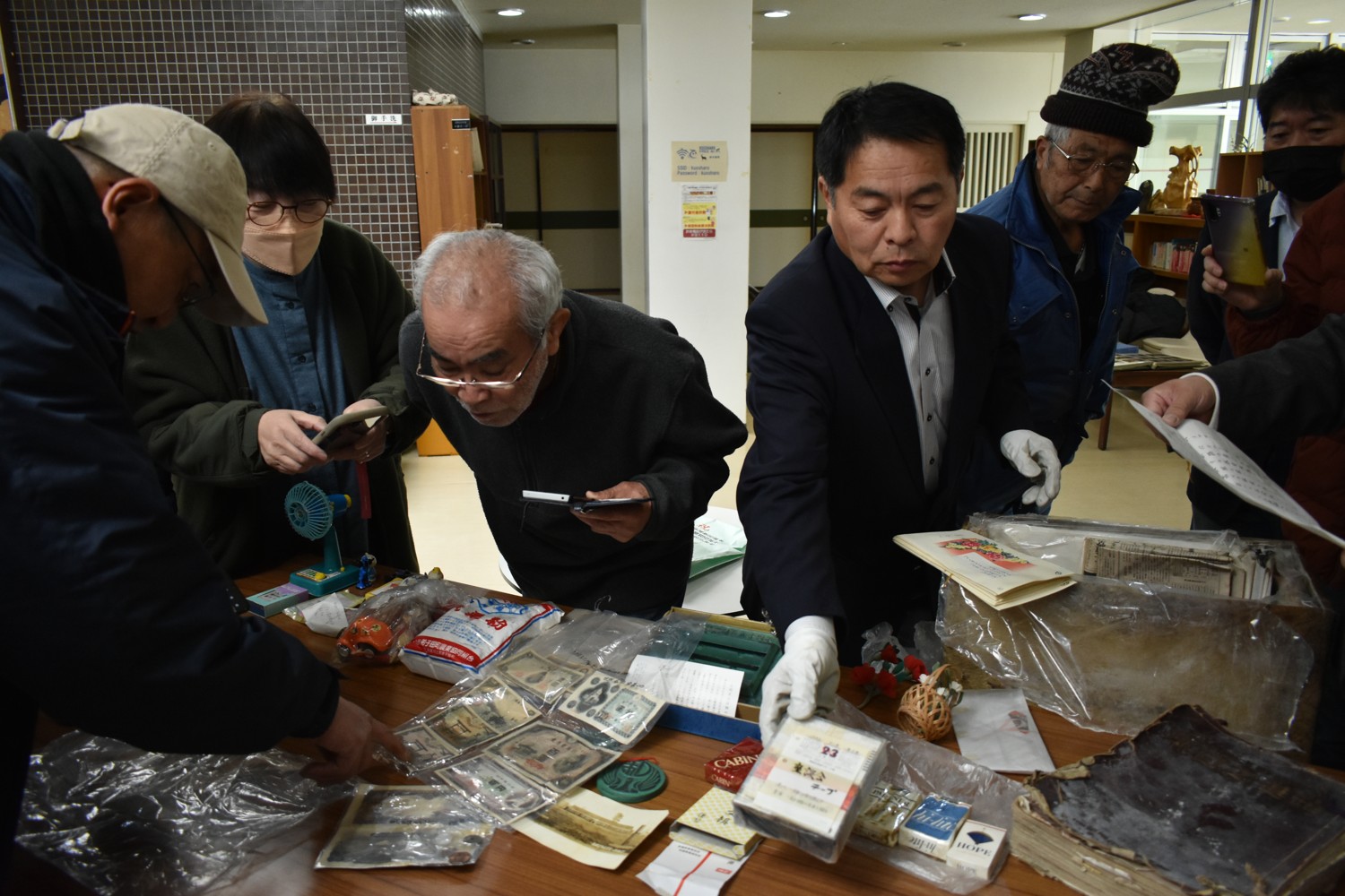 [写真/タイムカプセルの中身を次々と取り出す金澤会長(右から3人目)]